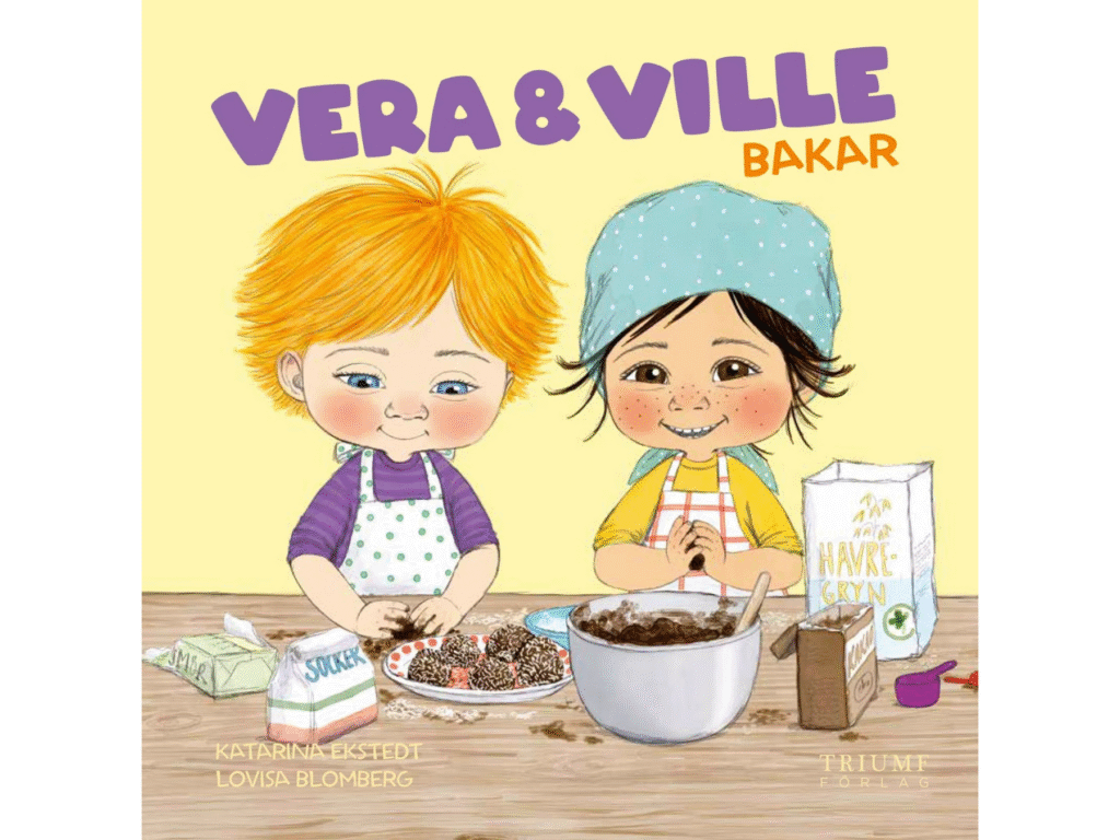 Vera & Ville bakar av Katarina Ekstedt, med illustrationer av Lovisa Blomberg, är en bok som gjorde vår läsning till något mer än bara en stund med text och bild, vi plockade fram ingredienserna och rullade egna chokladbollar. Jag tycker om hur språket är enkelt och tydligt, men ändå med en lekfull ton som gör att barnen känner sig delaktiga. När jag bakade med mitt barnbarn märkte jag hur roligt hon tyckte det var att själv kunna “läsa” receptet och följa med i vad som skulle hända.